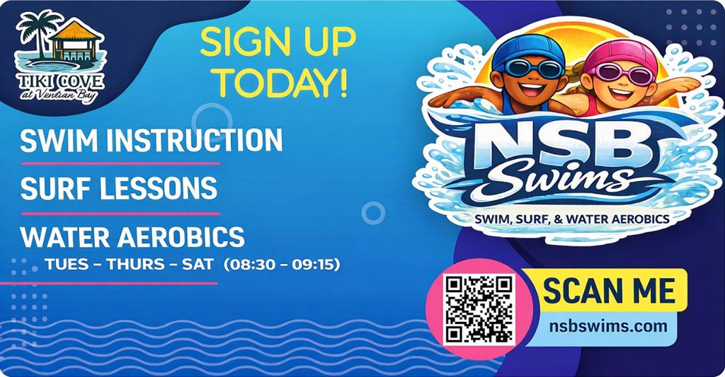 We’re excited to introduce a new partnership with NSB Swims, bringing professional swim instruction, surf lessons, and water aerobics directly to Tiki Cove at Venetian Bay.